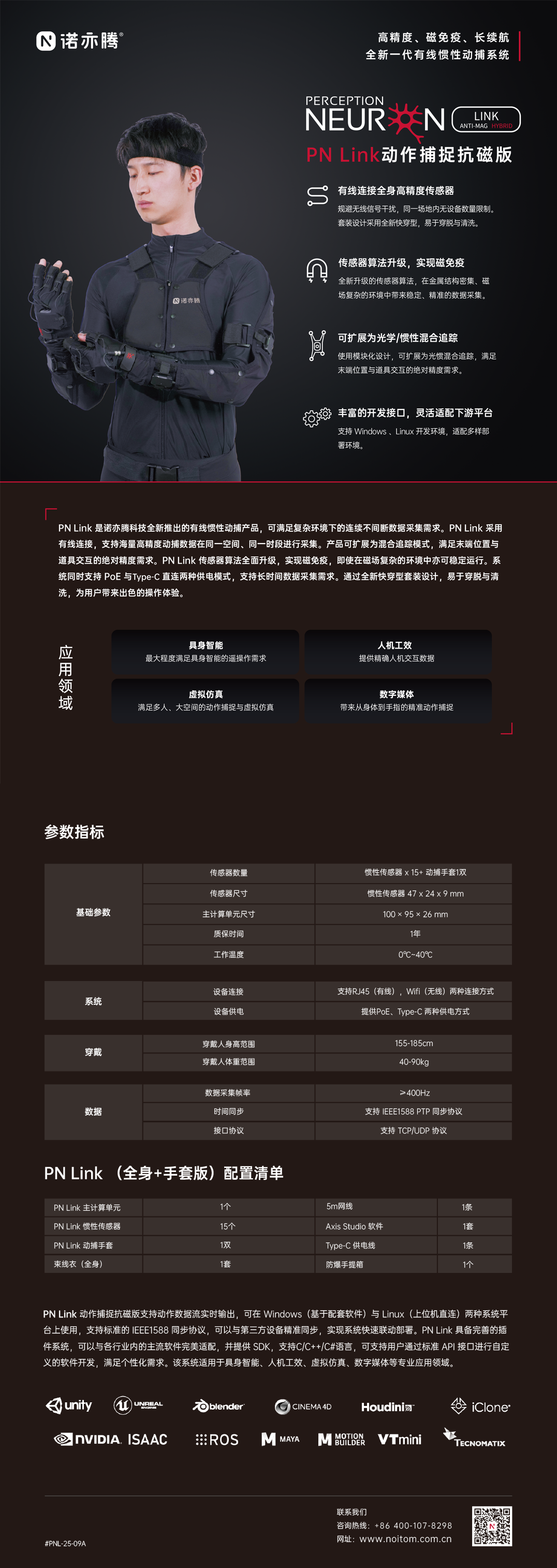 PN Link是诺亦腾全新一代有线惯性动捕产品。 采用有线连接,有效规避无线信号干扰,能够在同一场地内,进行同时段、多设备的动作捕捉。通过加装光学追踪器,可以扩展为混合追踪模式,满足末端位置与道具交互的绝对精度需求。通过对传感器算法的全面升级,带来了超强的抗磁性能,即使在复杂环境下,也可以进行稳定、精准的动作数据捕捉。系统同时支持PoE和Type-C直连两种供电模式,支持长时间数据采集需求。 PN Link适用于具身智能、人机工效、虚拟仿真、数字媒体等专业应用领域。