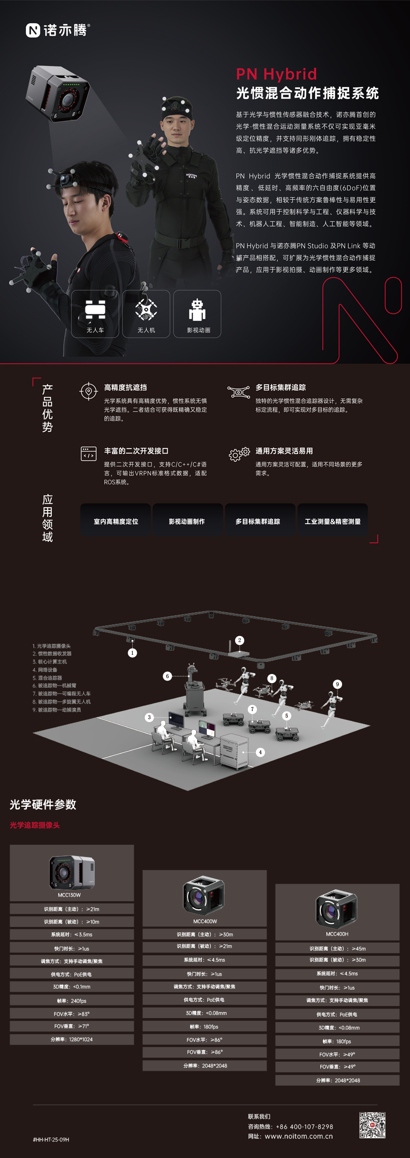 PN Hybrid 光学惯性混合动作捕捉系统提供高精度 、 低延时、高频率的六自由度(6DoF)位置与姿态数据,相较于传统方案鲁棒性与易用性更强。系统可用于控制科学与工程、仪器科学与技术、机器人工程、智能制造、人工智能等领域。高精度抗遮挡 光学系统具有高精度优势,惯性系统无惧 光学遮挡。二者结合可获得既精确又稳定 的追踪。 多目标集群追踪 独特的光学惯性混合追踪器设计,无需复杂 标定流程,即可实现对多目标的追踪。 丰富的二次开发接口 提供二次开发接口,支持C/C++/C#语 言,可输出VRPN标准格式数据,适配 ROS系统。 通用方案灵活易用 通用方案灵活可配置,适用不同场景的更多 需求。 室内高精度定位 影视动画制作 多目标集群追踪 工业测量&精密测量 PN Hybrid 与诺亦腾PN Studio 及PN Link 等动捕产品相搭配,可扩展为光学惯性混合动作捕捉产品,应用于影视拍摄、动画制作等更多领域。
